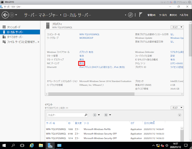 - 「サーバーマネージャー」→「ローカルサーバー」にて、「NICチーミング」の「無効」の文字を選択する。